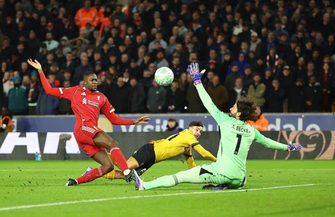 然而,利物浦的喘息只是短暂的,灾难在补时阶段无情降临。第94分钟,阿利松的解围出现致命失误,狼队中场安德烈在禁区边缘得球后果断起脚怒射。皮球击中利物浦后卫乔·戈麦斯后发生巨大变线,划出一道诡异的弧线,令阿利松鞭长莫及。